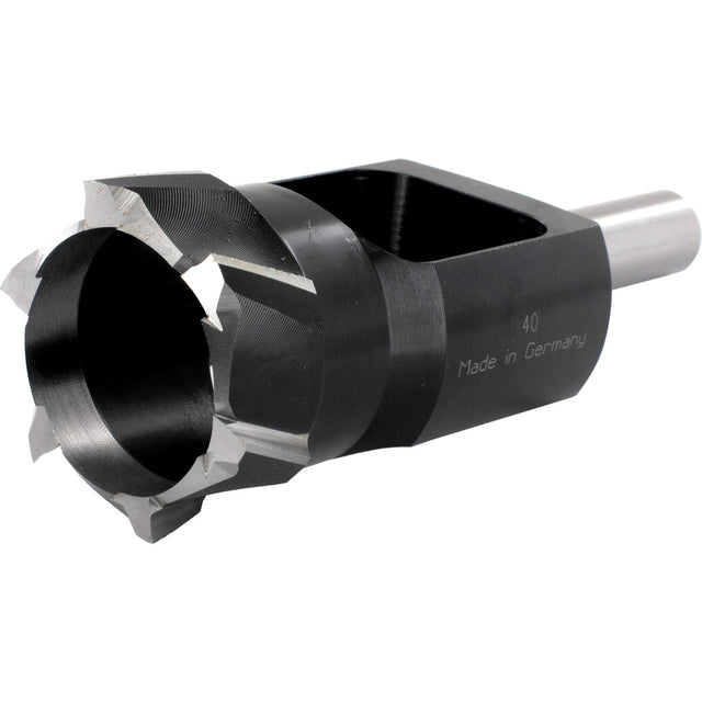 - positionieren Sie den Zapfenschneider so am Werkstückrand, dass der entstehende Kreisring seitlich geöffnet ist und ein guter Spanauswurf möglich wird.